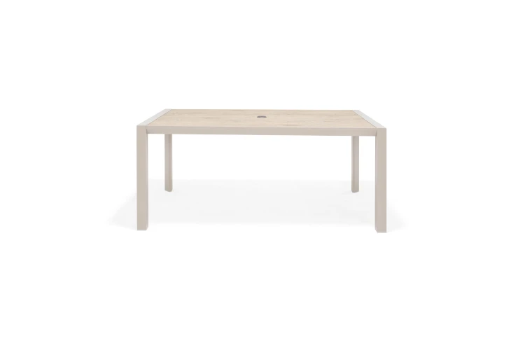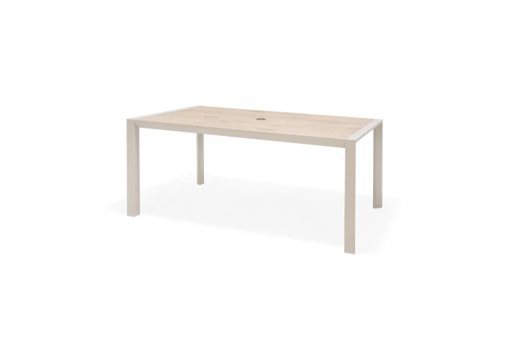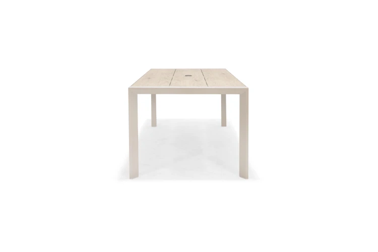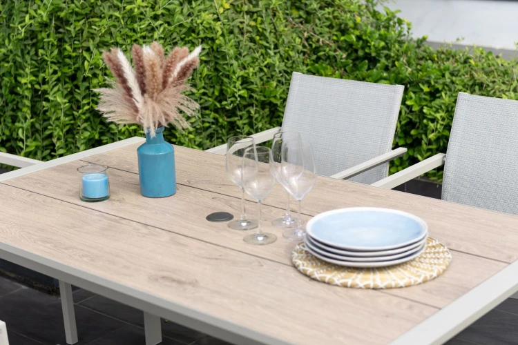 Bàn được làm bằng khung nhôm chống gỉ và mặt bàn DuraBoard® chắc chắn và bền bỉ, đảm bảo có thể chịu được điều kiện thời tiết khắc nghiệt. Bạn chỉ cần lau sạch nhanh bằng khăn ẩm là bàn sẽ trông như mới. Các thanh gỗ in tinh tế được tăng cường, mang đến vẻ ngoài tự nhiên hòa hợp hoàn hảo với không gian ngoài trời tuyệt vời. Hình dạng và kiểu dáng gọn gàng với chân bàn cách điệu mang đến cảm giác hiện đại và tối giản. Hình dạng chắc chắn với chân đế chắc chắn khiến đây trở thành một món đồ nội thất ngoài trời chắc chắn có thể sử dụng trong nhiều năm tới. Bàn có lỗ ô che nắng, cho phép bạn thưởng thức bữa ăn dưới bóng râm.