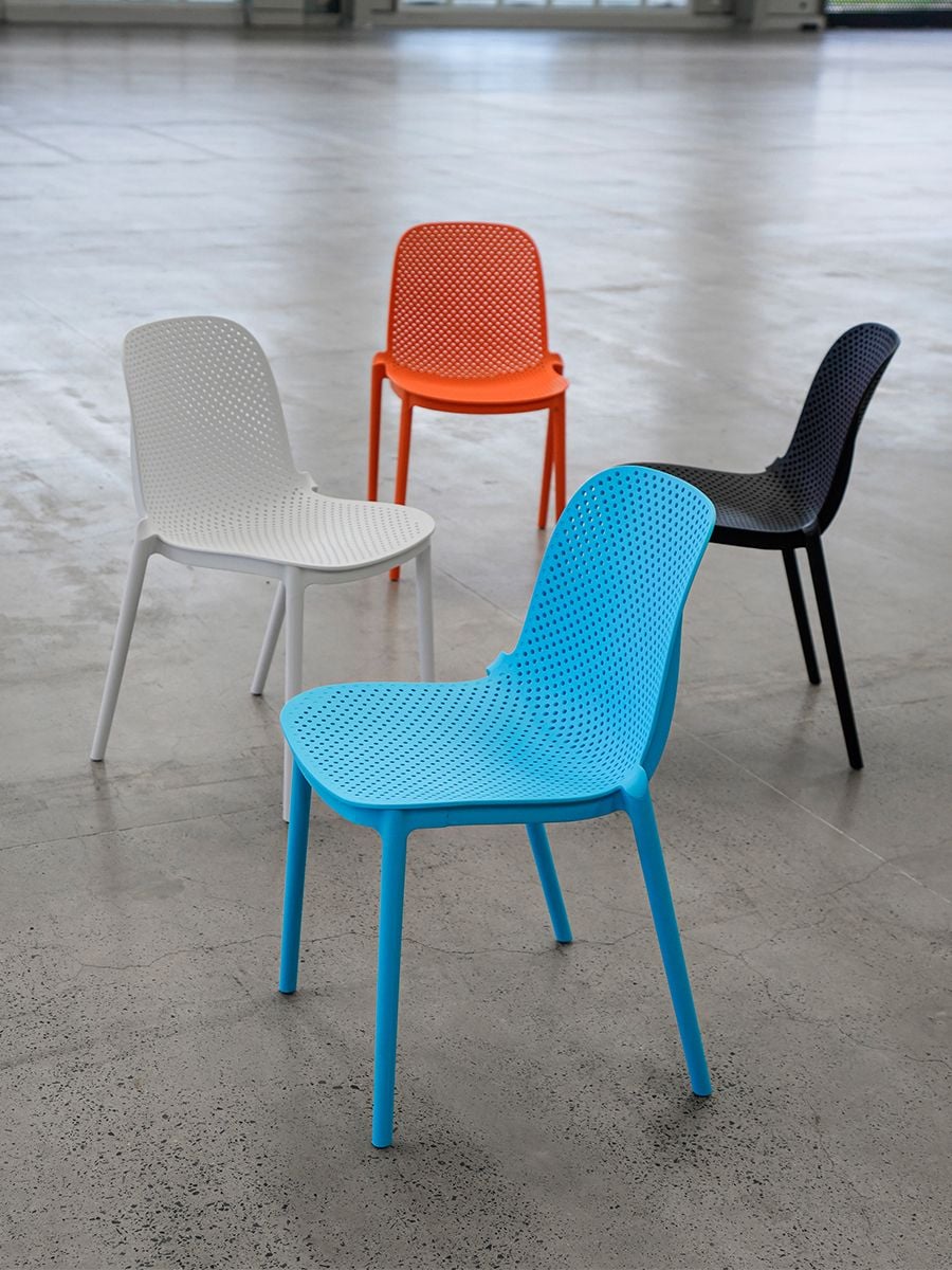 Mặt ngồi và lưng tựa được thiết kế đục lỗ thông thoáng, dễ dàng lau chùi.