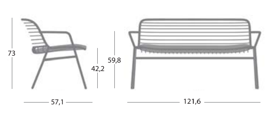 Chất liệu: Khung ghế bằng sắt sơn phủ Epoxy. Nệm ghế bằng vải Cast Horizon ngoài trời trượt nước, có thể tháo rời.